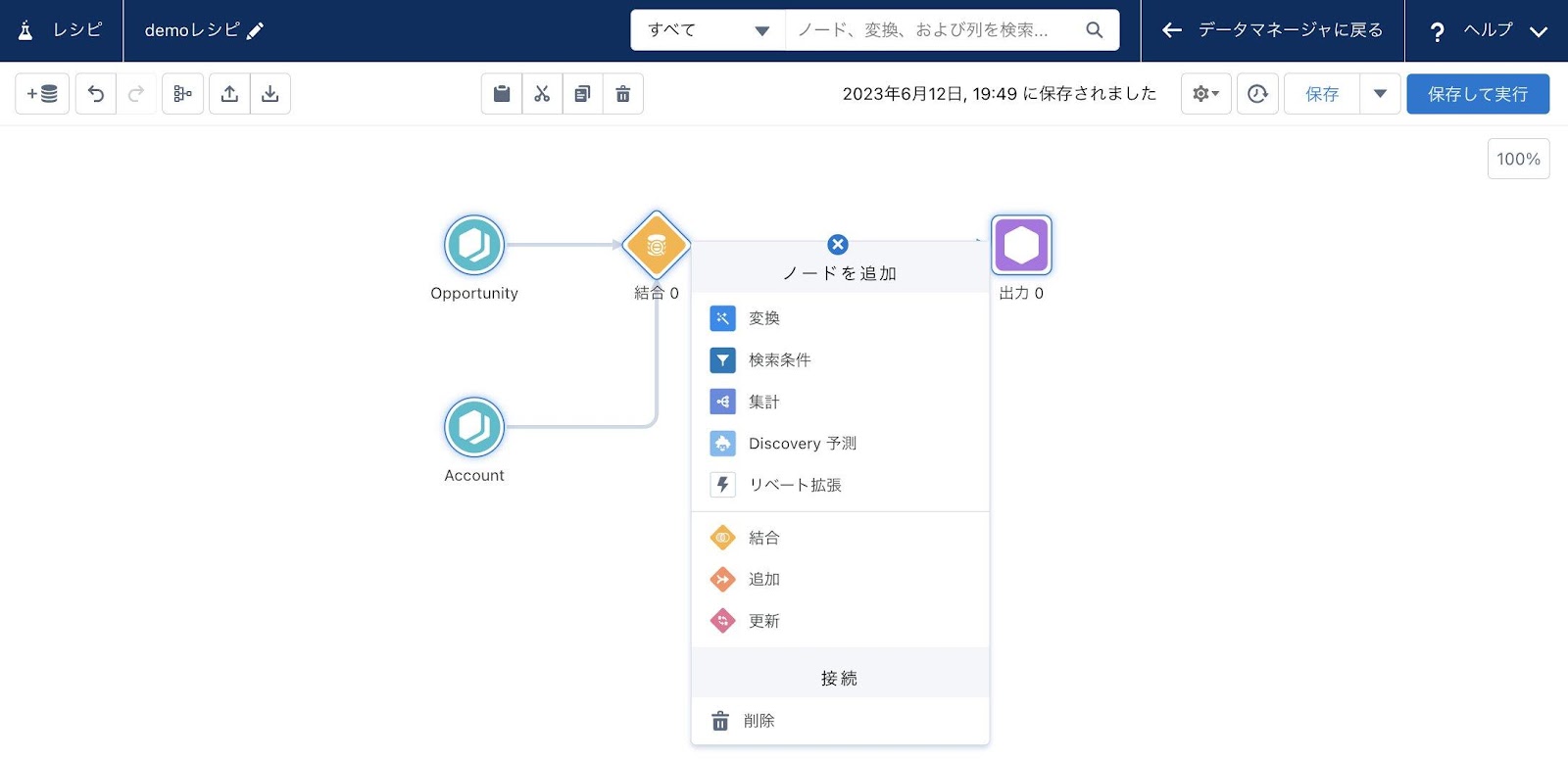 データ加工を行いデータセットを作成することができます。例として、SalesforceからAnalyticsにデータを取り込む場合、取引先や商談や所有者の情報を呼び出します。しかし呼び出しているだけでは、単なる別々の情報の一覧でしかありません。それぞれの情報を内部的に紐付ける必要があります。それぞれのデータを紐付けて最終的にデータセットを作成します。呼び出したデータを結合して最終的にデータセットを作る流れを定義したものがレシピとなります。