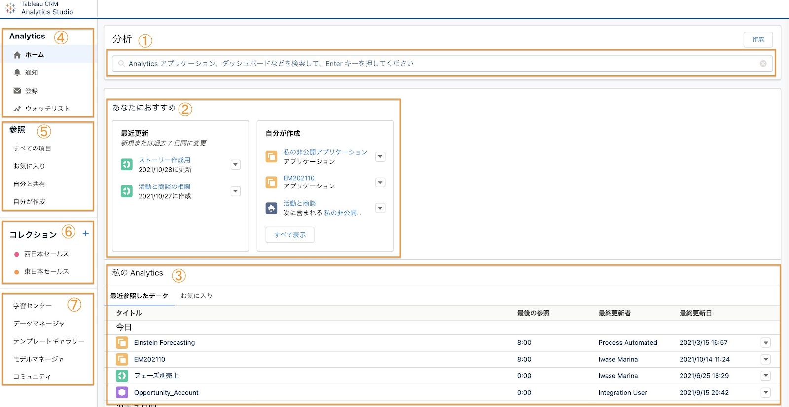 CRM Analytics のホーム画面で可能な操作を理解するためのドキュメント