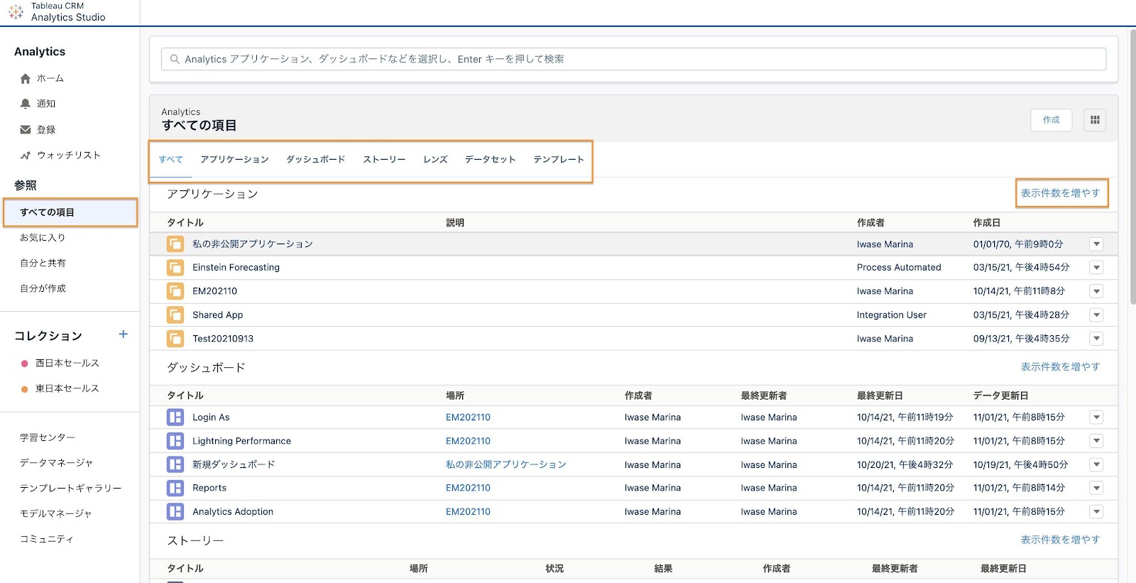 すべての項目画面ではアプリケーションやダッシュボード等、各タブ毎に作成されているアセットを表示することができます。