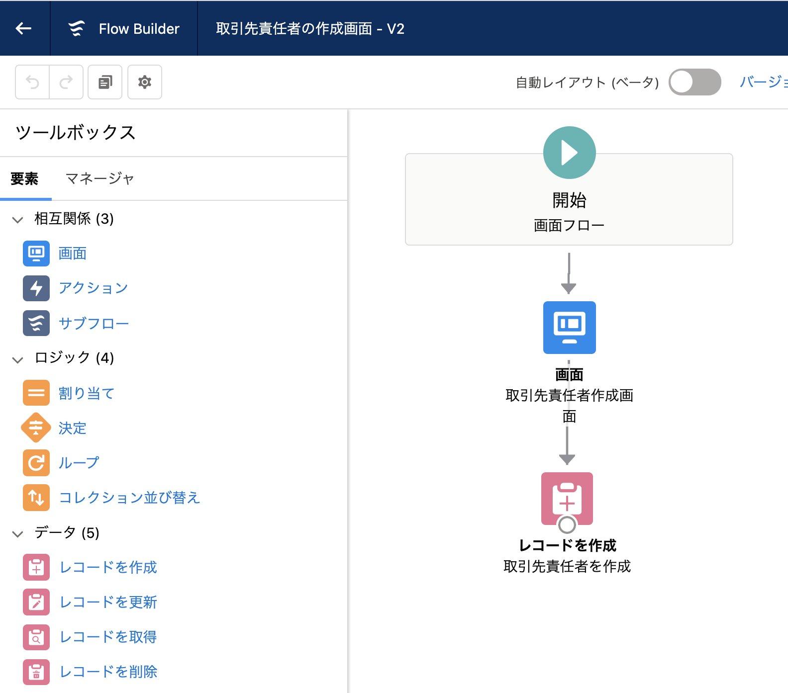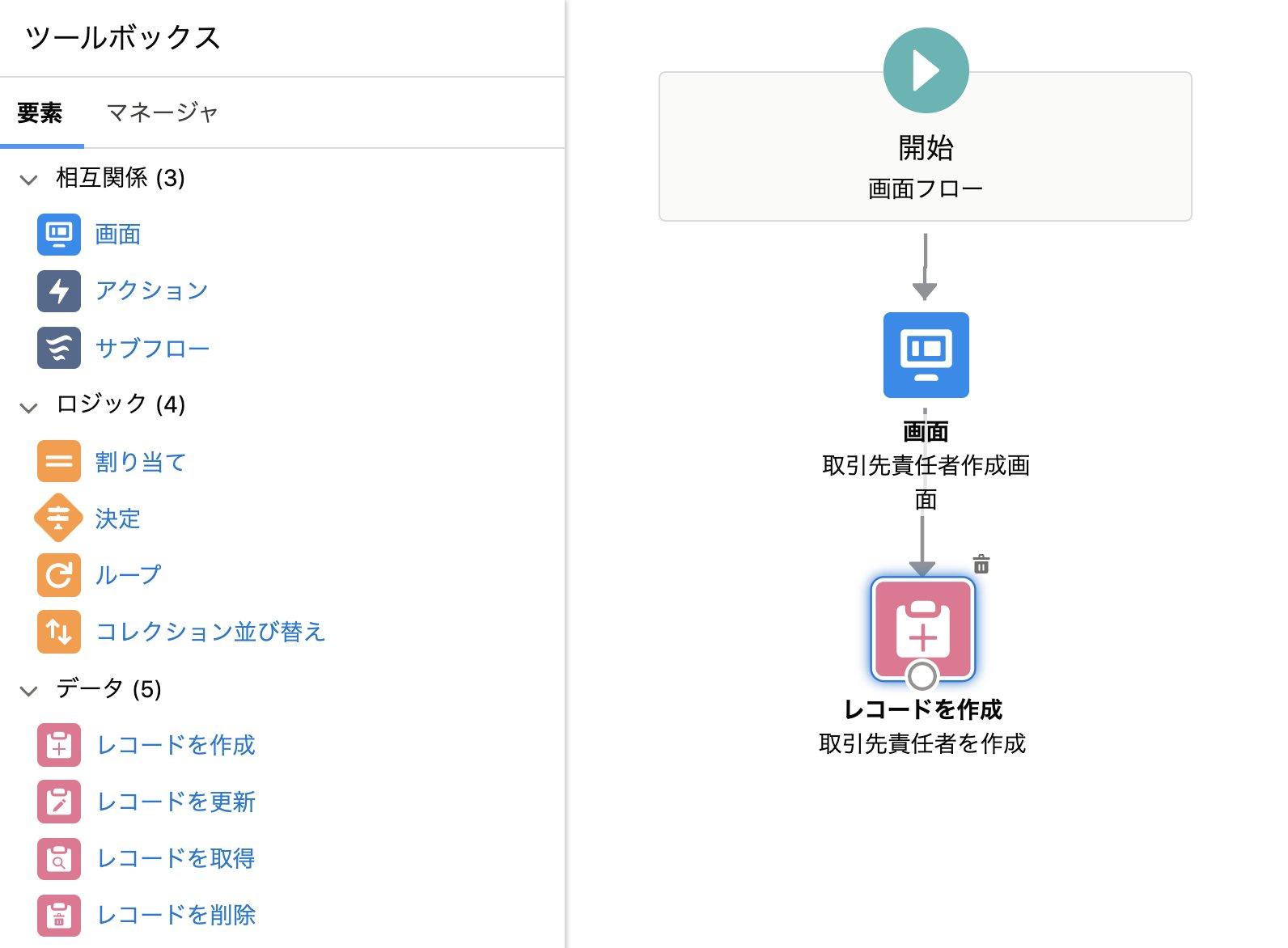 画面に入力した値をもとに取引先責任者のレコードを新規作成するフローです