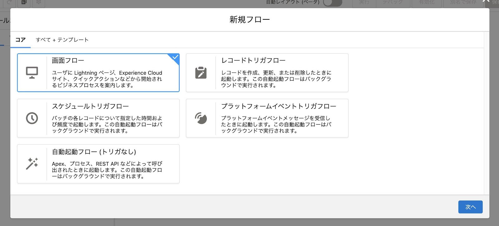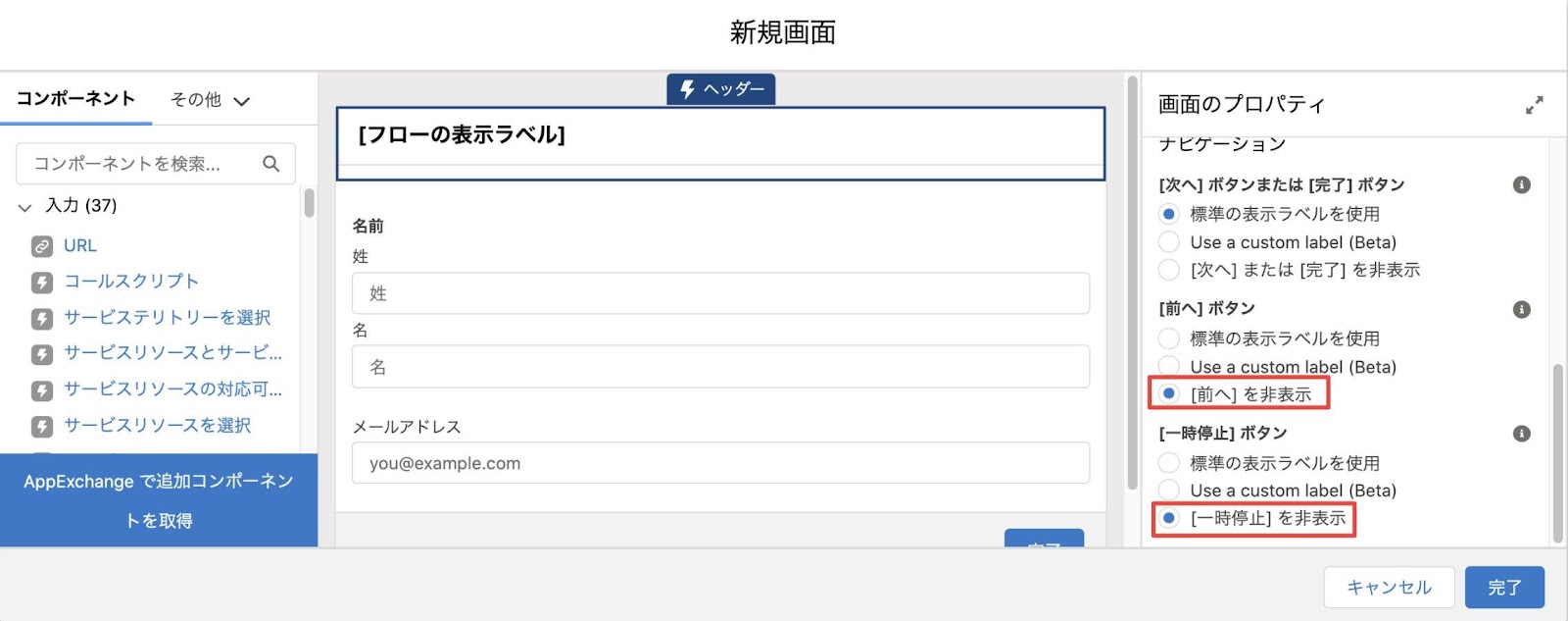 画面右上の「保存」をクリックし、フローの表示ラベル、フローのAPI参照名に任意の値を入力し保存します
