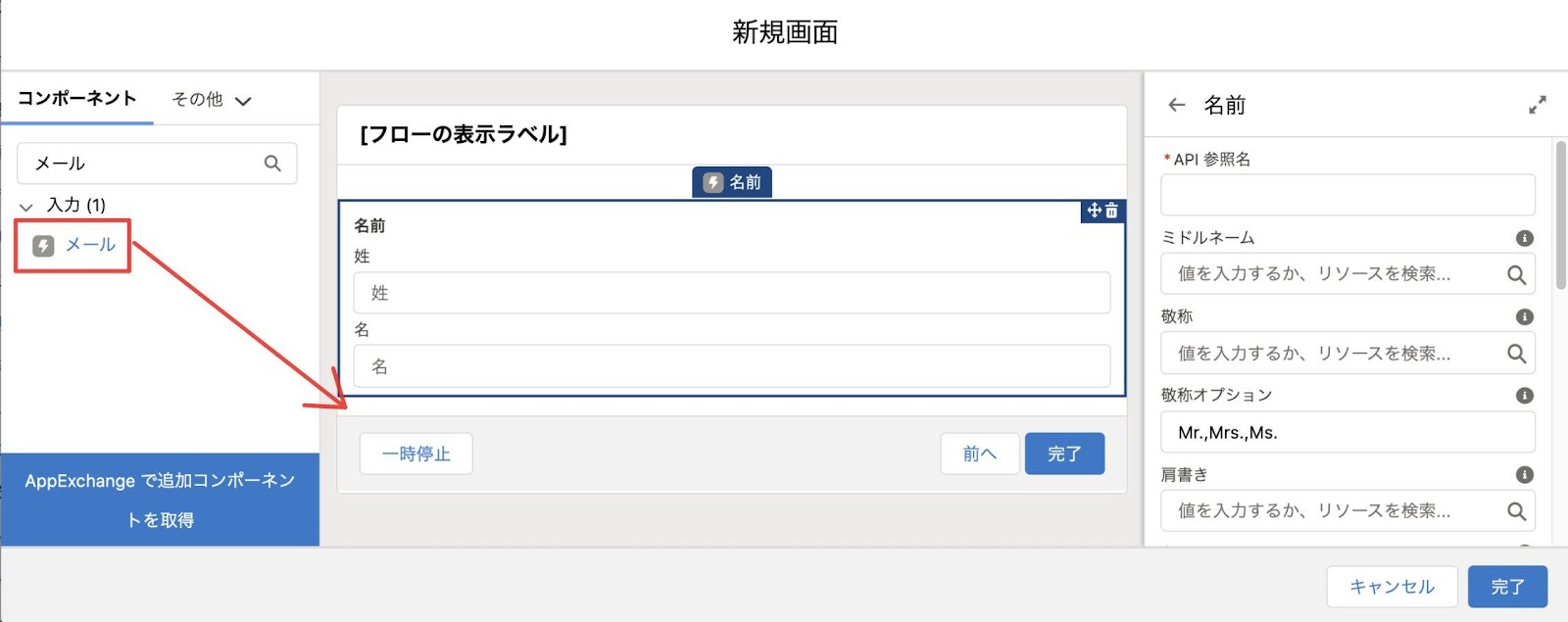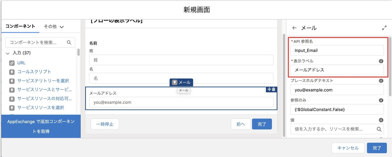 「メール」を選択し、API参照名に「Input_Email」、表示ラベルに「メールアドレス」を入力します