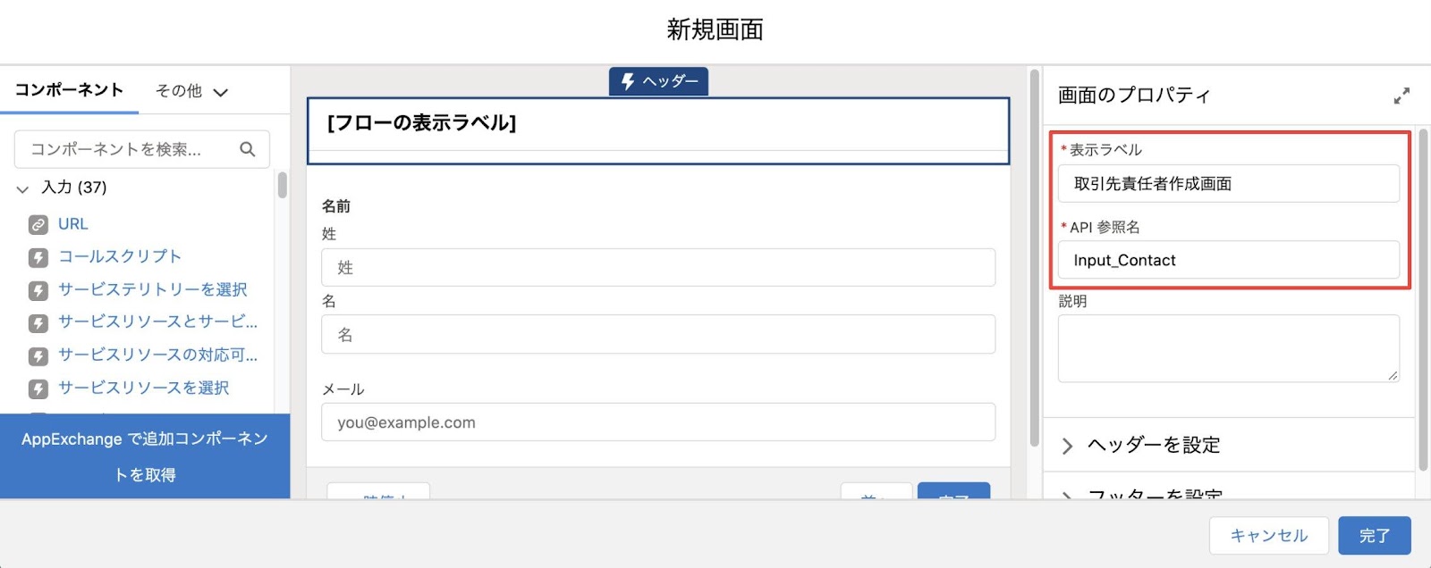 「ヘッダー」を選択し、画面のプロパティの表示ラベルに「取引先責任者作成画面」を、API参照名に「Input_Contact」を入力します