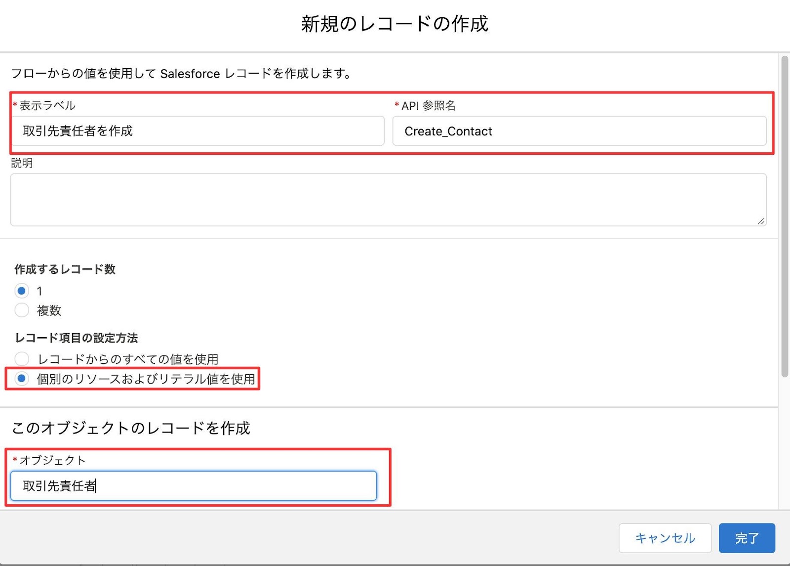 表示ラベルに「取引先責任者を作成」、API参照名に「Create_Contact」を入力します