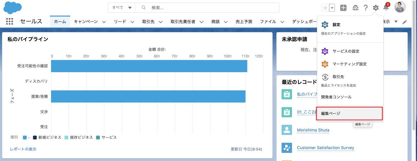 フローを追加したいページ(下図はホームのページ)から設定 > 編集ページ を選択します
