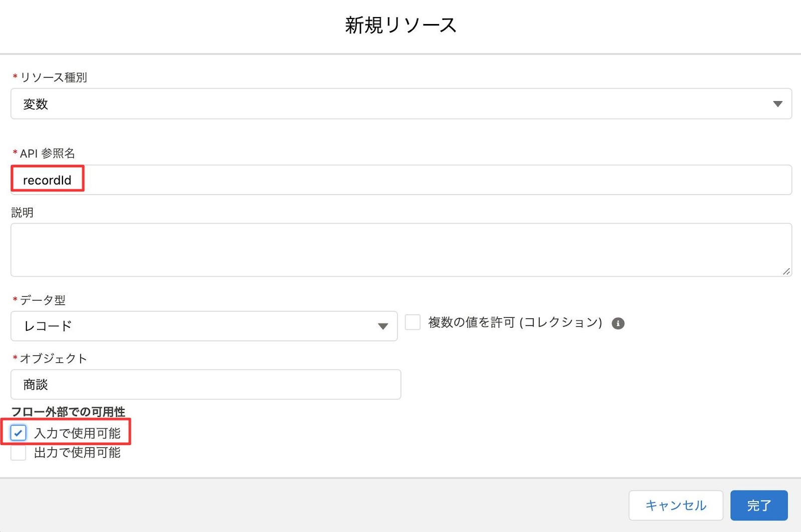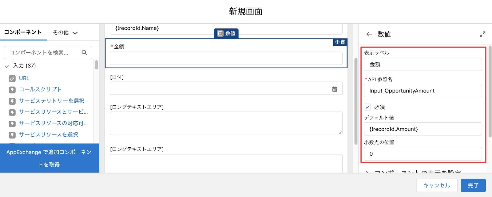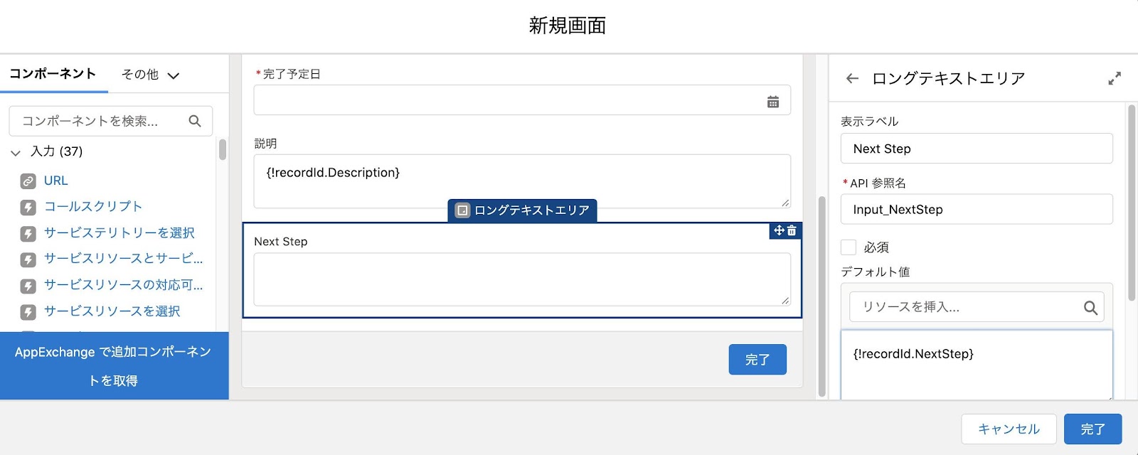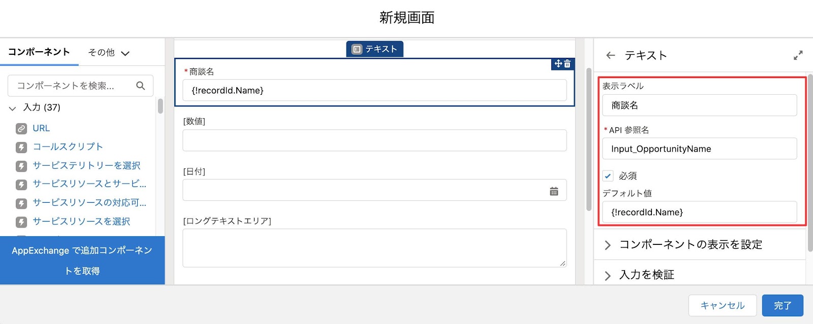 ※デフォルト値に{!recordId.Name}を設定することにより、画面で開いている商談の商談名がデフォルトで入力されます