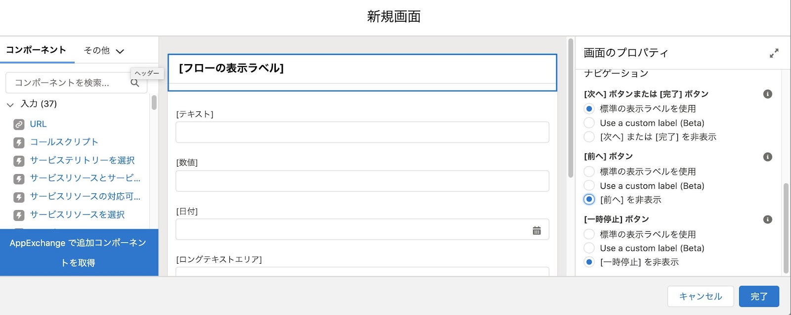 「ヘッダー」を選択し、画面のプロパティの表示ラベル、API参照名を入力します