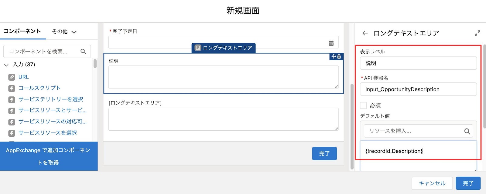 1つ目のロングテキストエリアのコンポーネントを選択し、下図の設定を行います