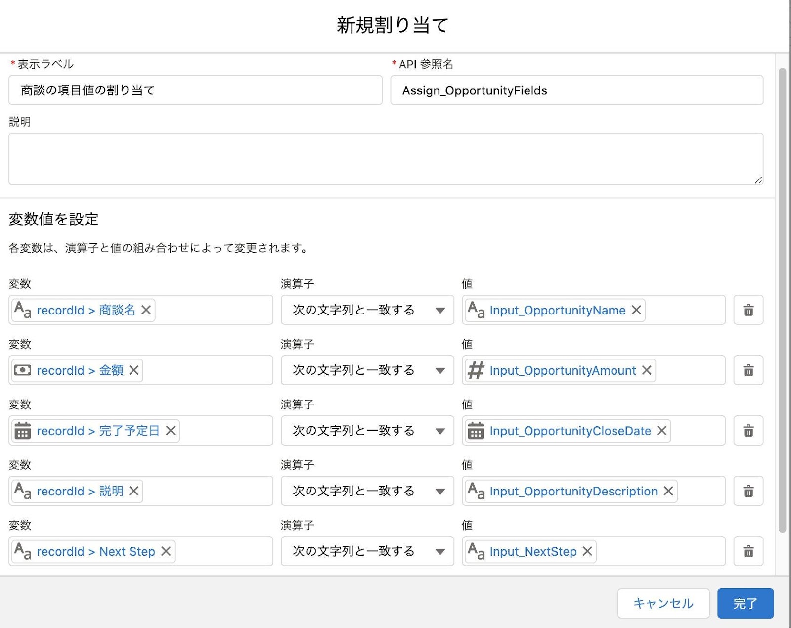 下図のように設定を行い、「recordId」変数の各項目に画面で入力された値を割り当てます