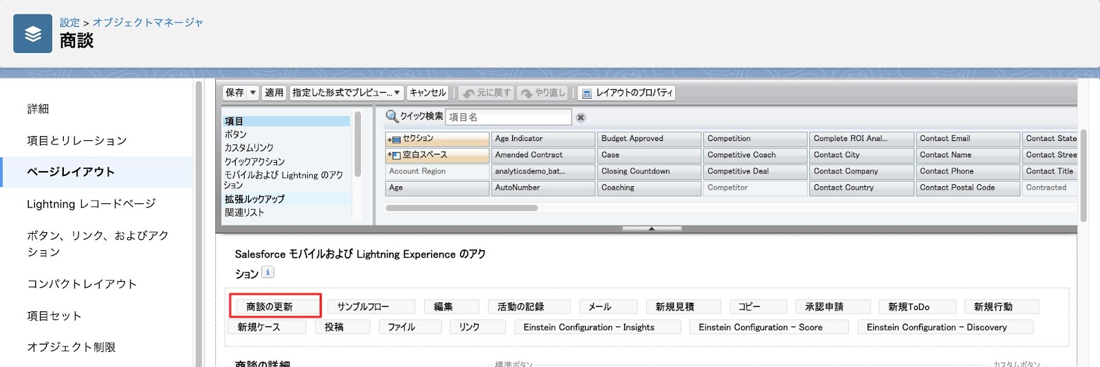オブジェクトマネージャで「商談」を選択し、「新規アクション」をクリックします