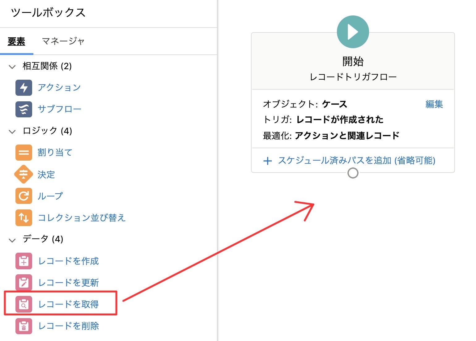 「要素」のタブから「レコードを取得」を選択し追加します