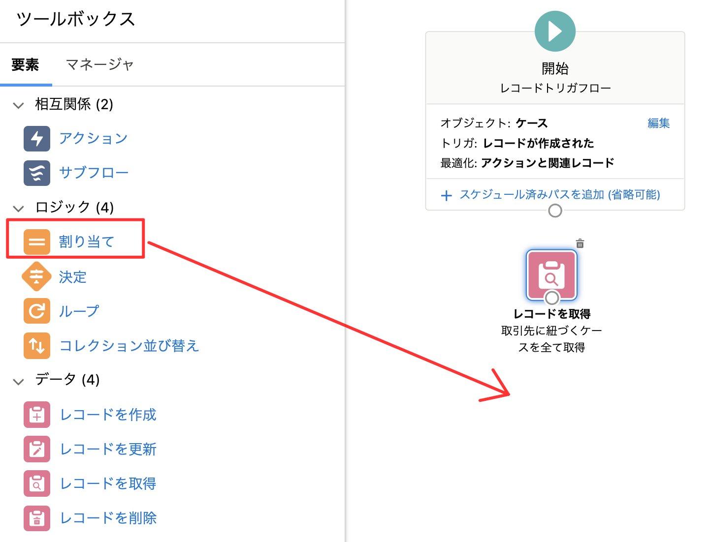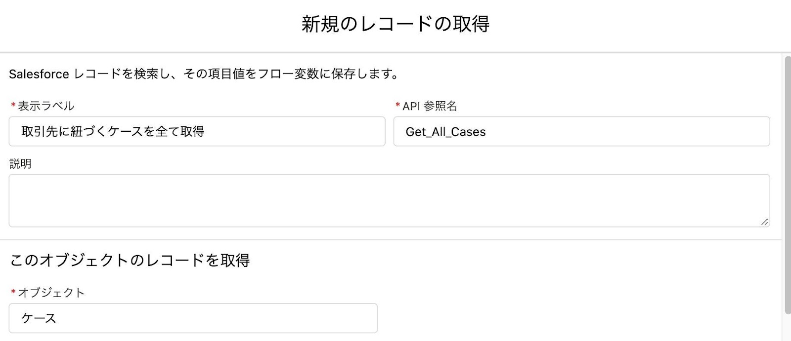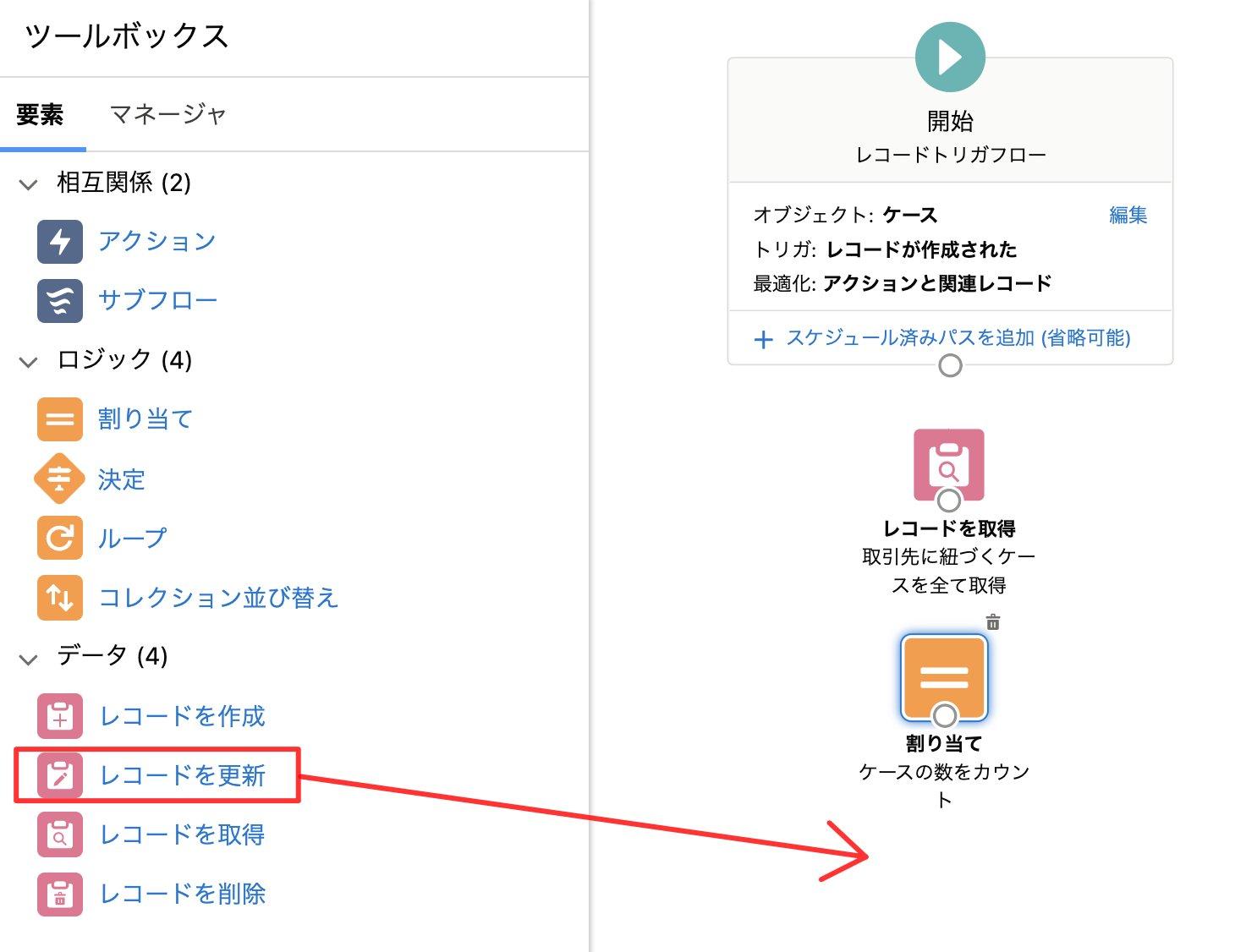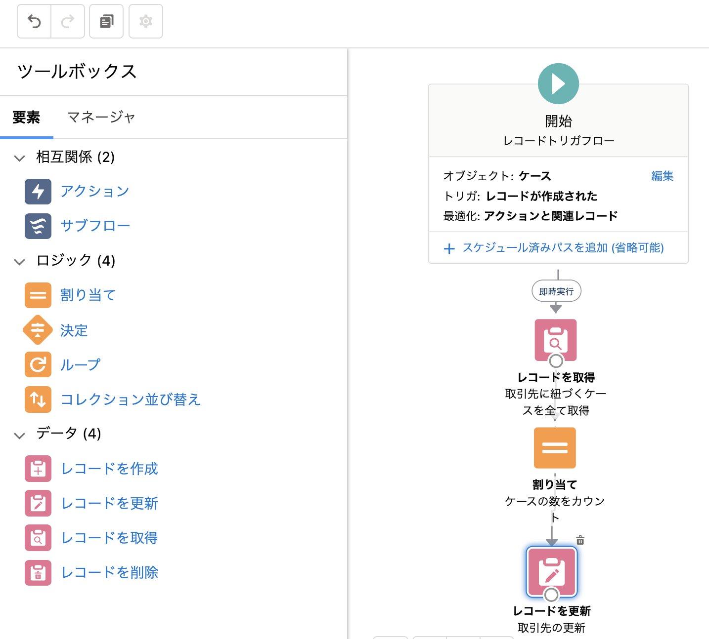 ケースが新規作成された際、関連する取引先に紐づくケースの数を集計し、取引先の項目を更新するフローです