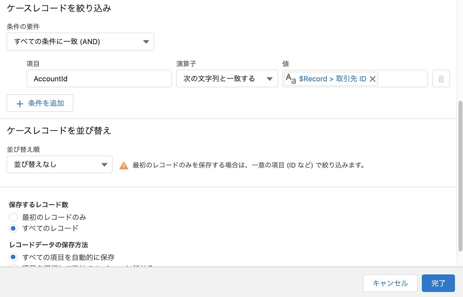 下図のように設定を行い、取引先に紐づくすべてのケースを取得します