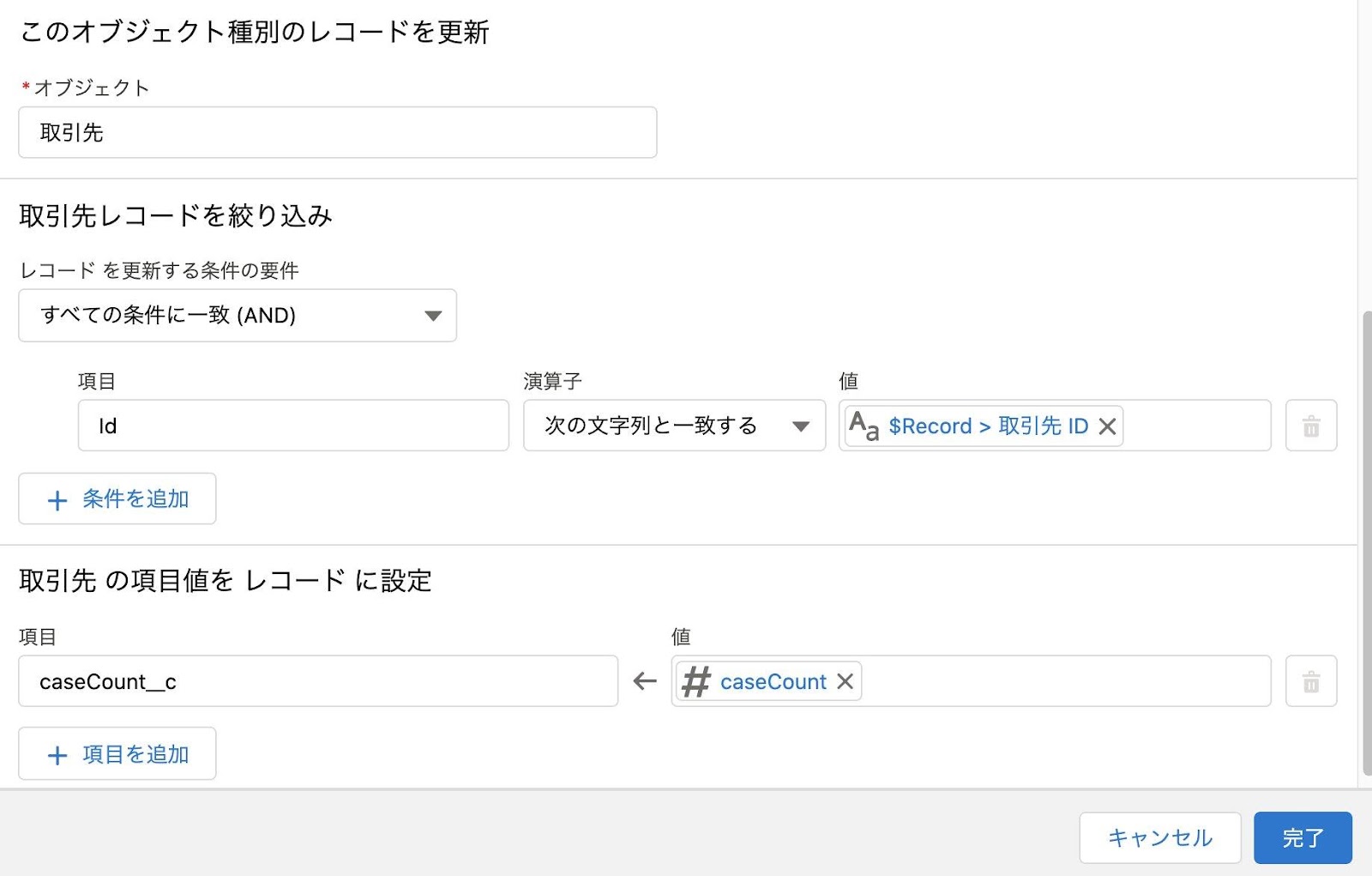 下図のように設定を行い、取引先のケースの集計値の項目を更新します