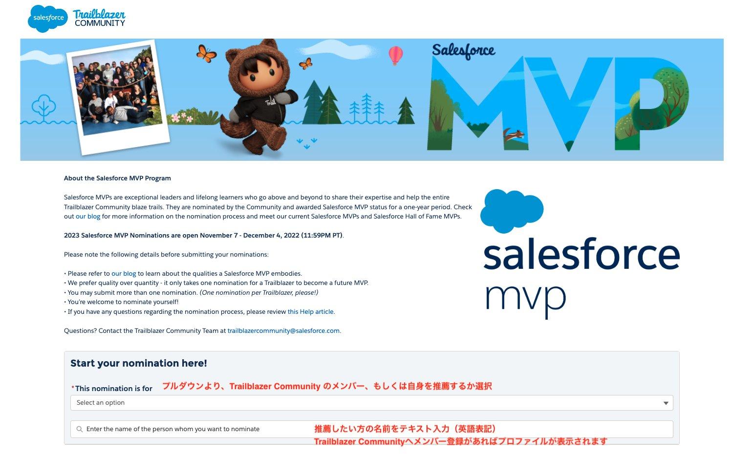 2023年度のSalesforce MVPのノミネートは、2022年12月4日(太平洋時間)まで受付中です。