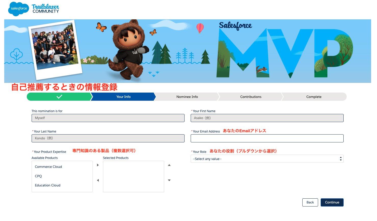 Trailblazer Communityメンバーを推薦する時、自己推薦する時で登録内容が変わります。