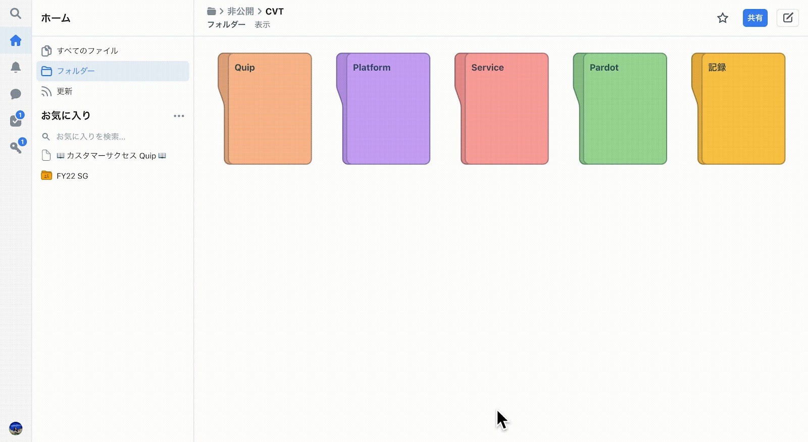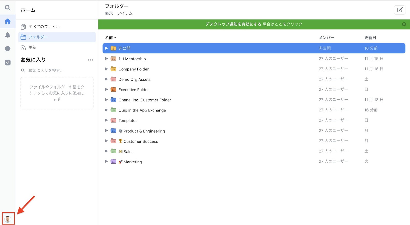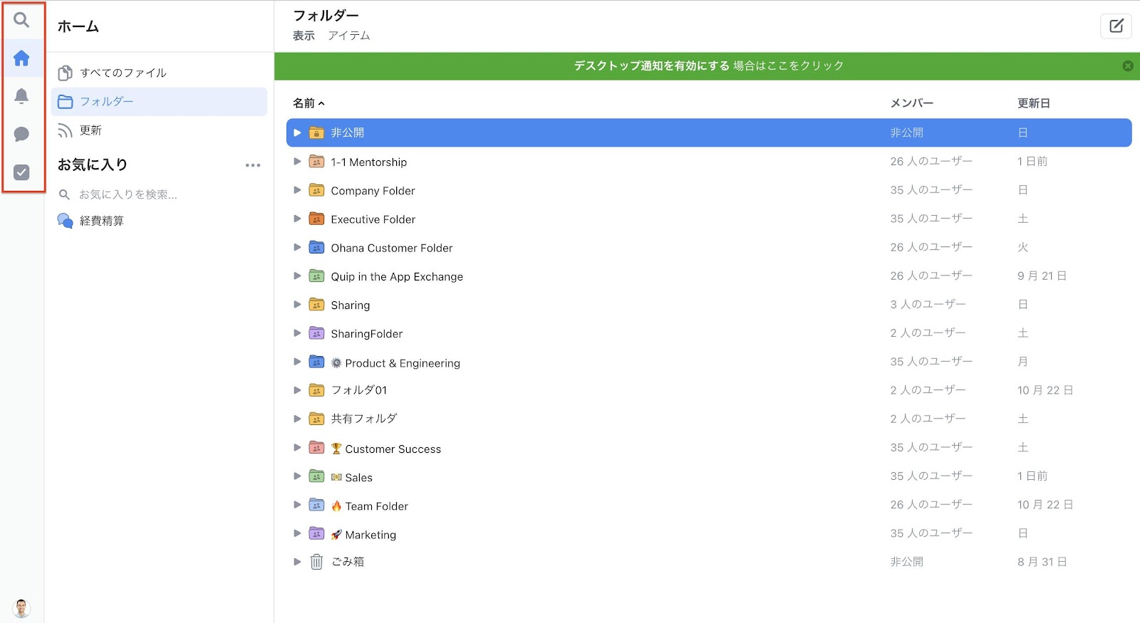 - ホーム(家アイコン):自らがアクセス可能なQuipの保存先が表示されます。
