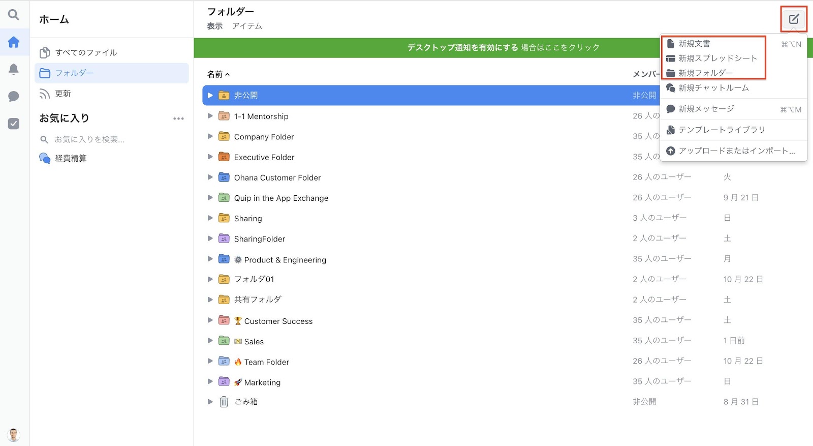 Quipでは新規文書だけではなく、新規スプレッドシート、新規フォルダを作成することが可能です。