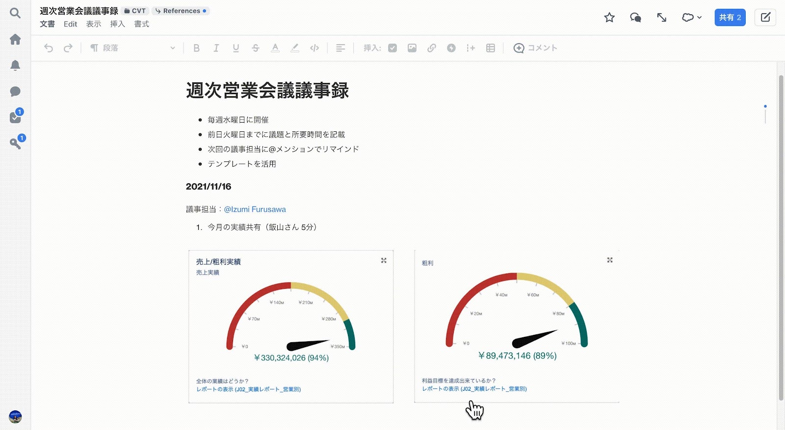 - 挿入:文書内にチェックリスト、画像&動画、リンク、LiveApps、列、表を追加することができます。
