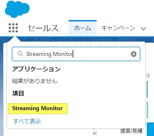 https://appexchange.salesforce.com/listingDetail?listingId=a0N3A00000FYEEWUA5&tab=e - パッケージが正常にインストールされると、アプリケーションランチャーにて“Streaming Monitor”が表示されます。
