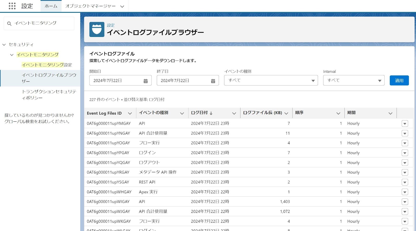 - [設定] から、クイック検索で“イベントモニタリング”と入力し、[イベントログファイルブラウザー] を選択します。