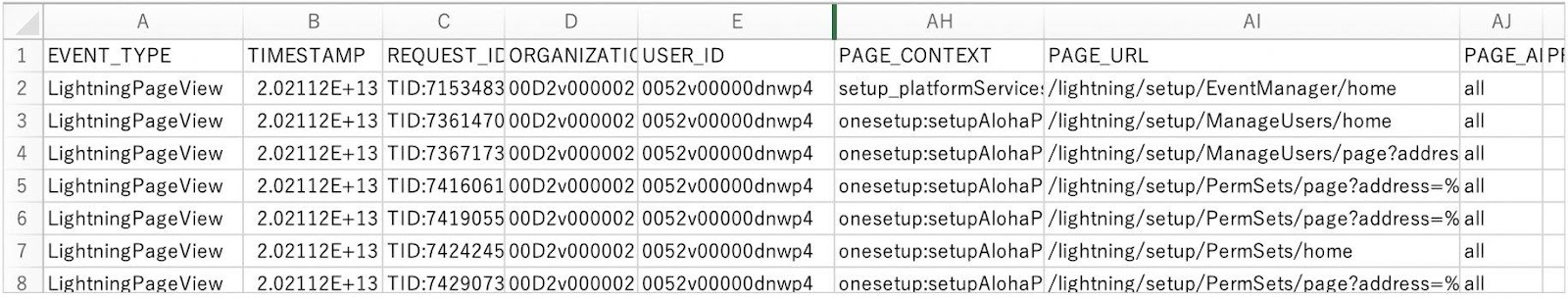 PAGE_URL項目でアクセスしたページやレコードを示すURLを、USER_ID項目でユーザのIDを確認することが可能です。