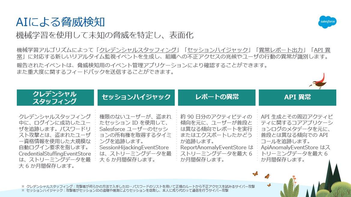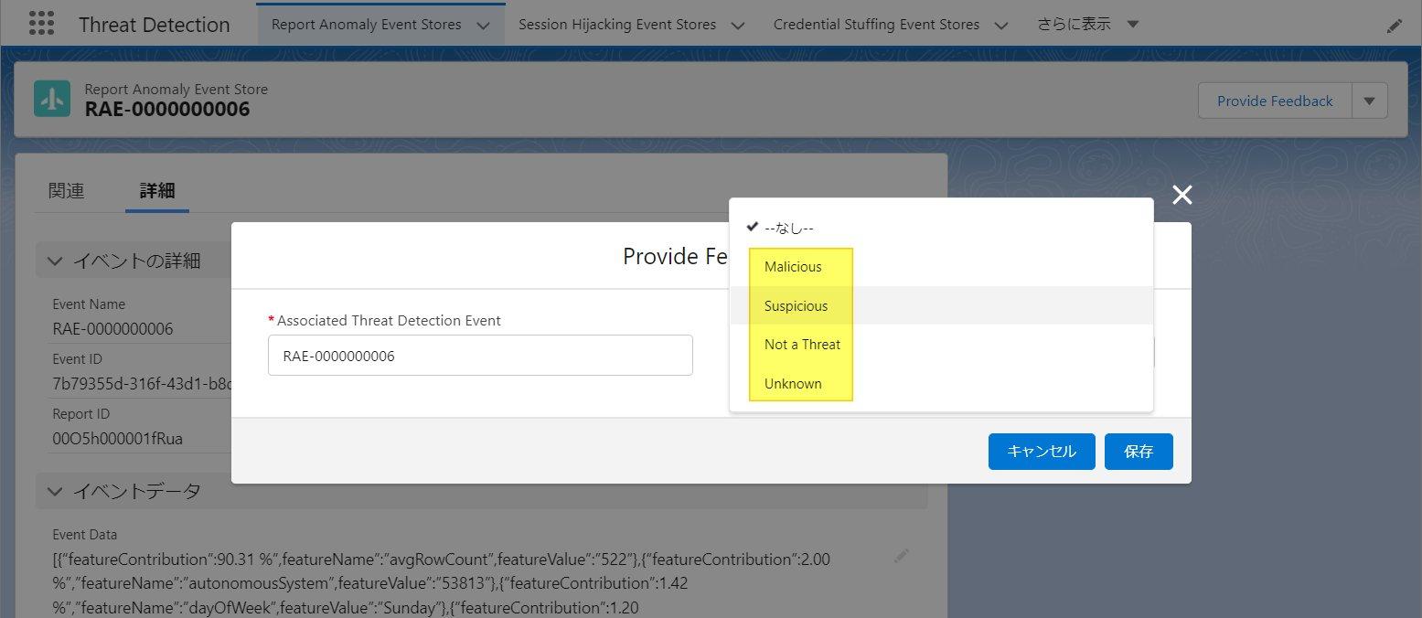 脅威検知機能はイベントモニタリングに含まれる機能の一つであり、統計および機械学習の手法を駆使してSalesforce組織に対する脅威を検知します。