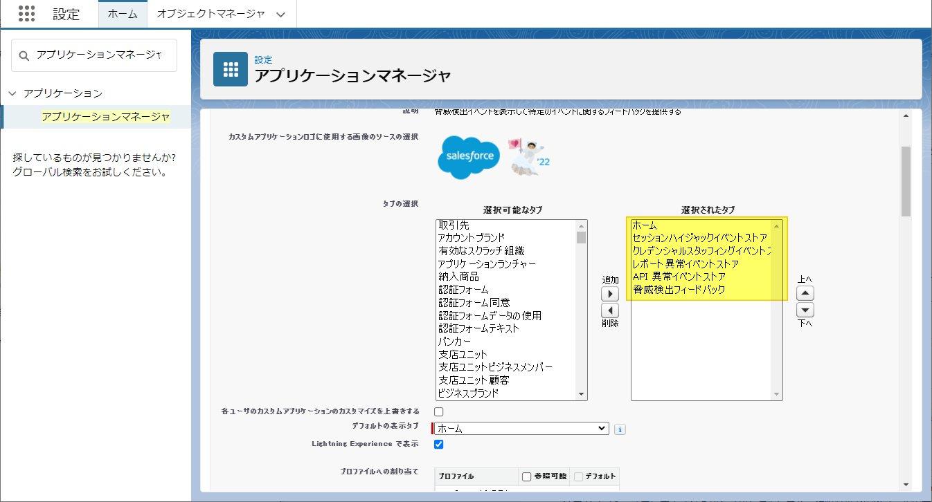 - 脅威検知アプリケーションを使用する各ユーザプロファイルの [タブの設定] を編集し、5 つのタブの表示を指定します。5 つのタブは、[セッションハイジャックイベントストア]、[クレデンシャルスタッフィングイベントストア]、[レポート異常イベントストア]、[API 異常イベントストア]、[脅威検知フィードバック] です。