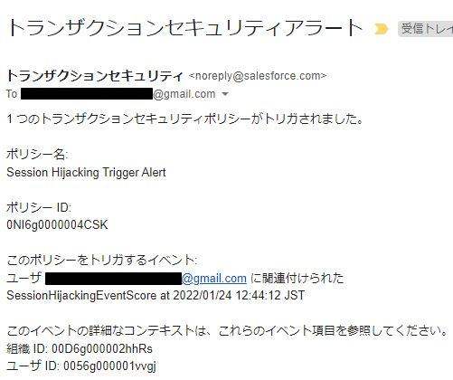ポリシーが有効な状態で、脅威検知機能により新たにセッションハイジャックイベントが生成された際には、以下のようなメール通知・アプリケーション内通知が指定された管理者に対して送信されます。