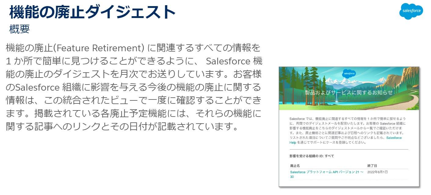 改めてのご案内となりますが、機能の廃止に関連するすべての情報を 1 か所で簡単に見つけることができるように、 Salesforce 機能の廃止のダイジェストを月次でメールをお送りしています。メールを受信されている管理者様はお見逃しのないようにご確認をお願いいたします。