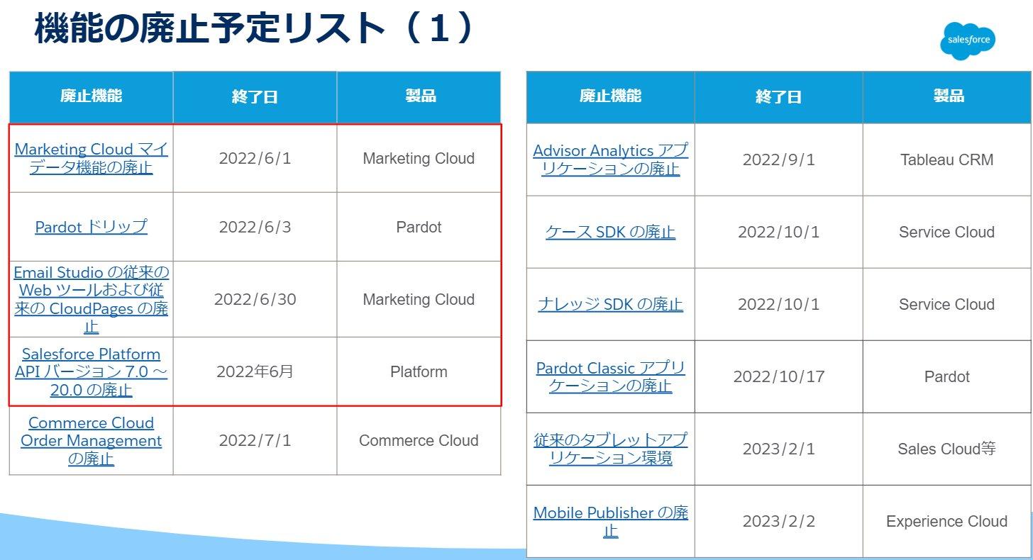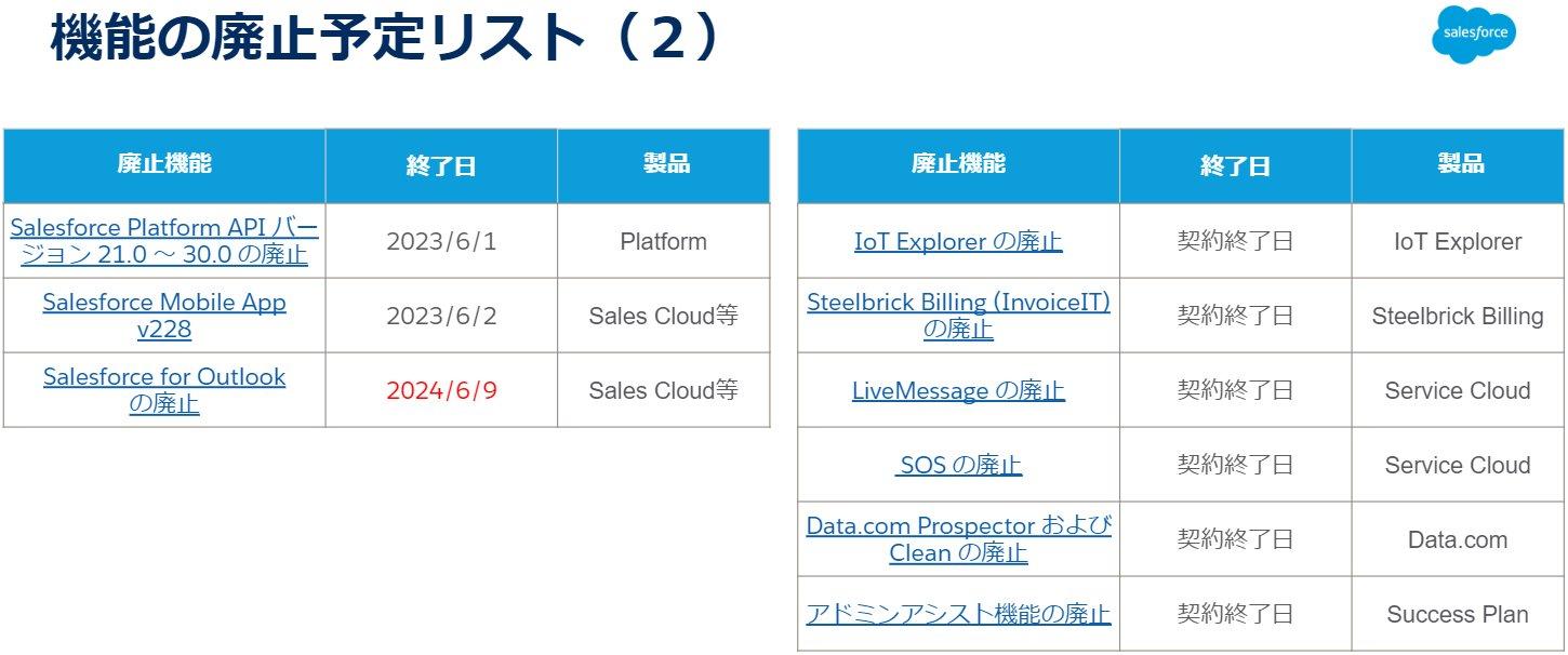 新たな追加情報ではございませんが、赤枠内の4点については6月に廃止予定となっておりますので該当機能をご利用中のお客様は、業務に影響を及ぼす場合もございますので下記リンクより詳細のご確認をお願いします。
