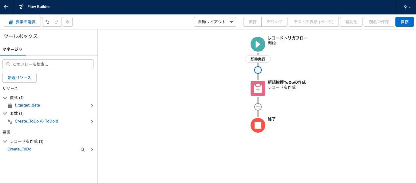 今回は取引先を作成したら、「ToDoを発行」したいので、次の処理としてToDo発行の処理をフローに追加します。