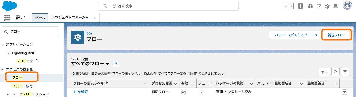設定画面か「フロー」を検索し、「フロー」の画面に遷移、「新規フロー」をクリックします。