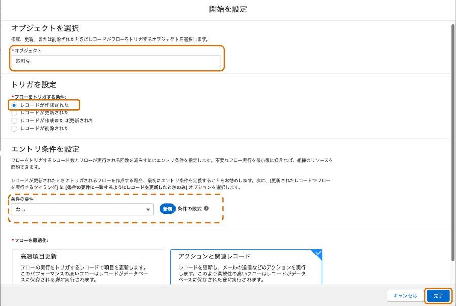 自動処理の開始条件を設定します。今回は、「取引先が新規に作成された時」に処理が実行されるようにしたいため、以下を設定します。