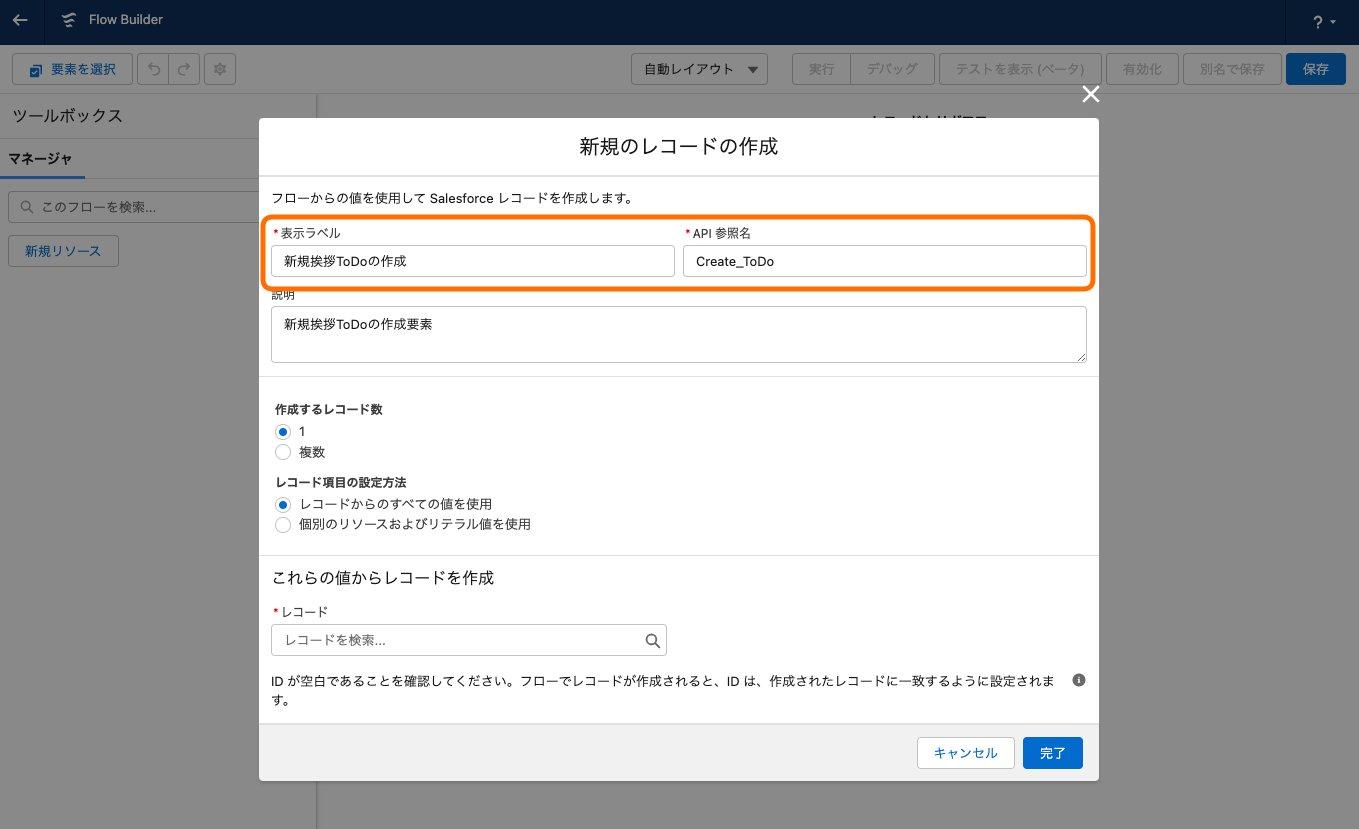 「新規のレコード作成」の窓が開くので、この処理の「表示ラベル」(フローでの表示名)とAPI参照名(処理に対してのプログラム上の名前)を設定します。