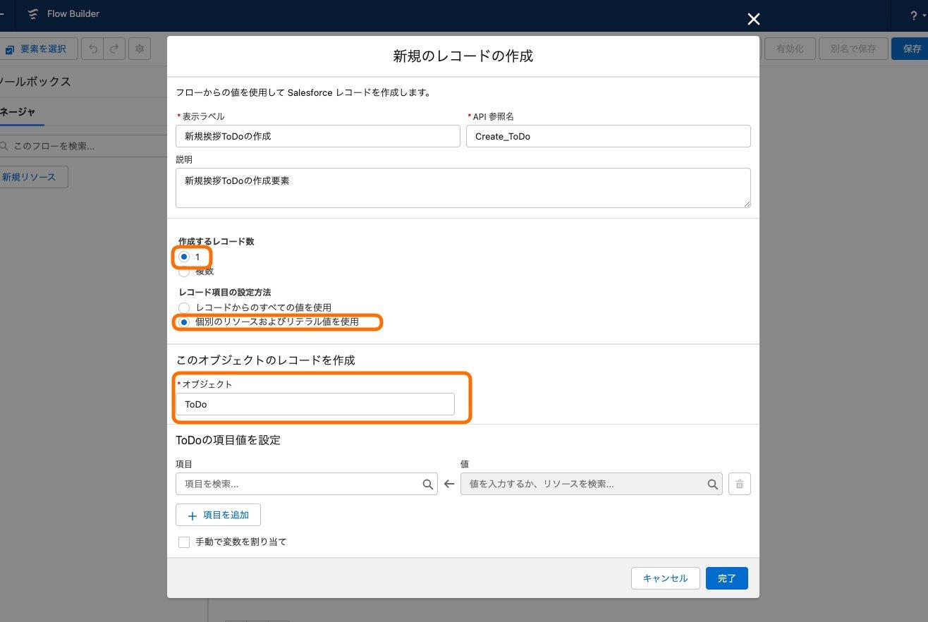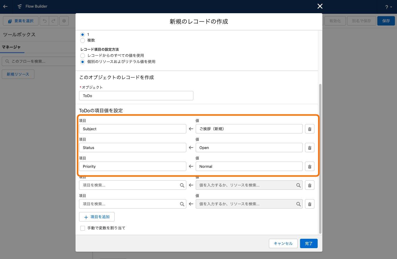 オブジェクトを選択すると、「作成するToDoの項目値を設定」が表示されるため、どの項目に(左側)何の値を入れるか(右側)を設定していきます。