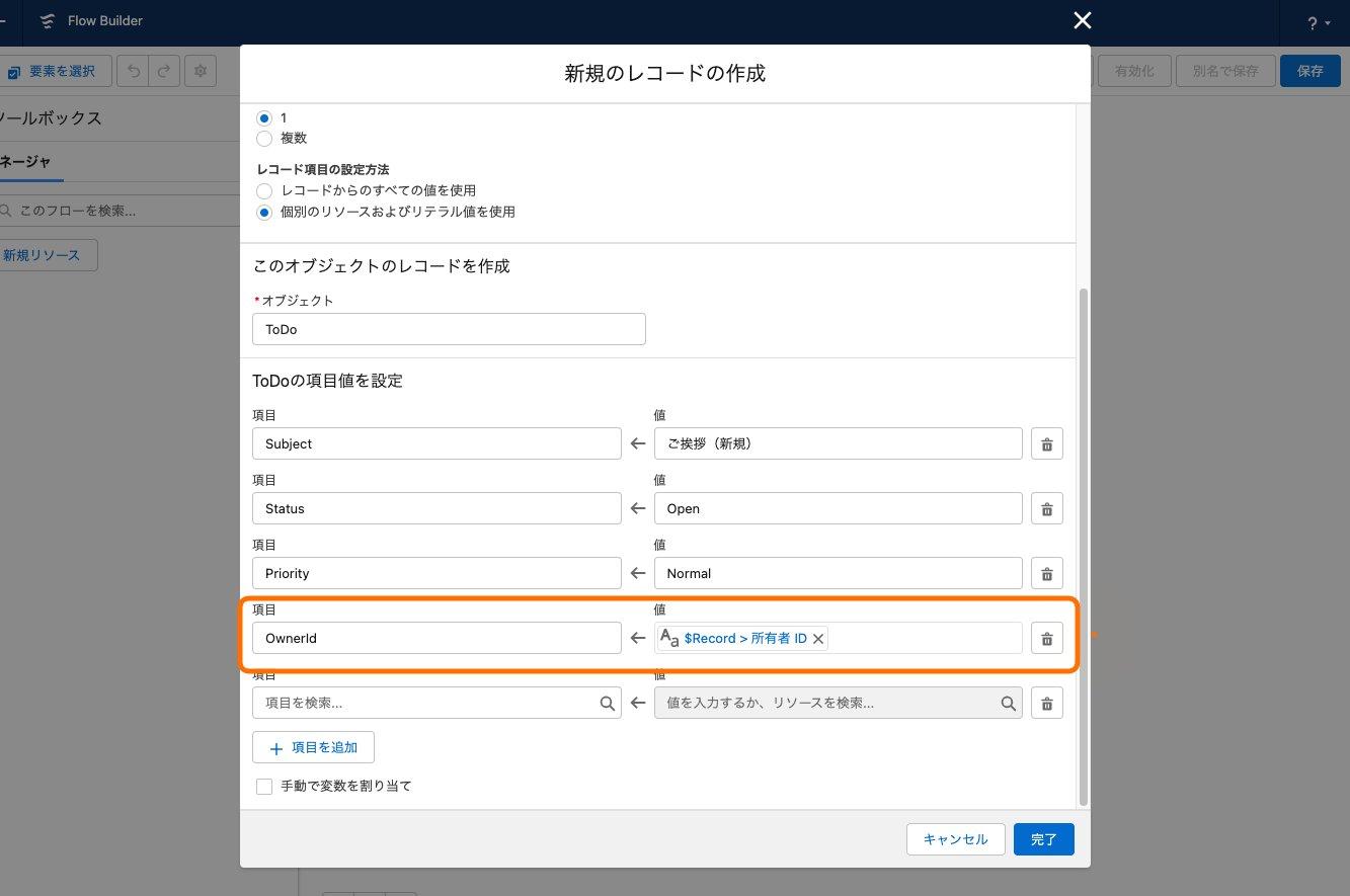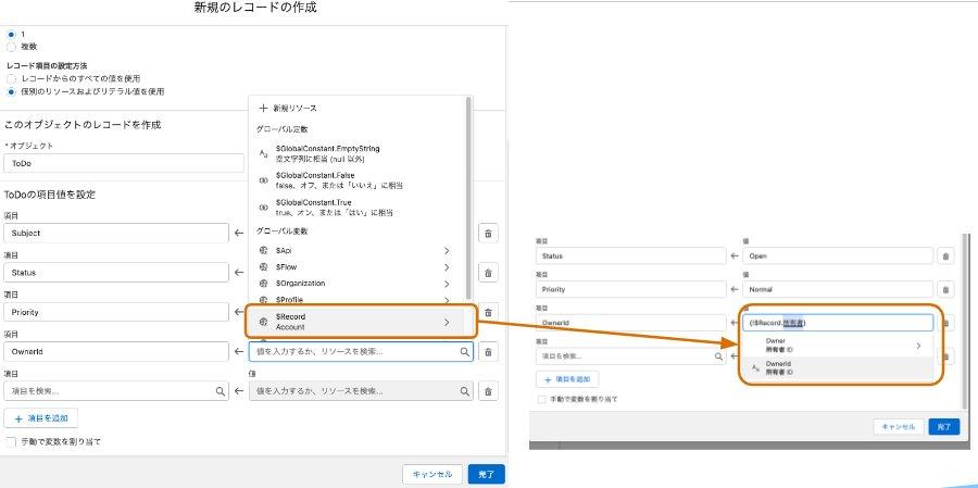 そのため、「$Record>所有者ID」の項目を選択することで、作成された取引先の所有者の情報を値として入れることができます。