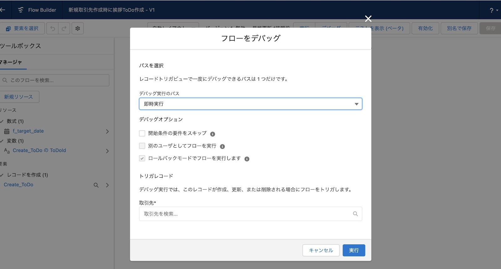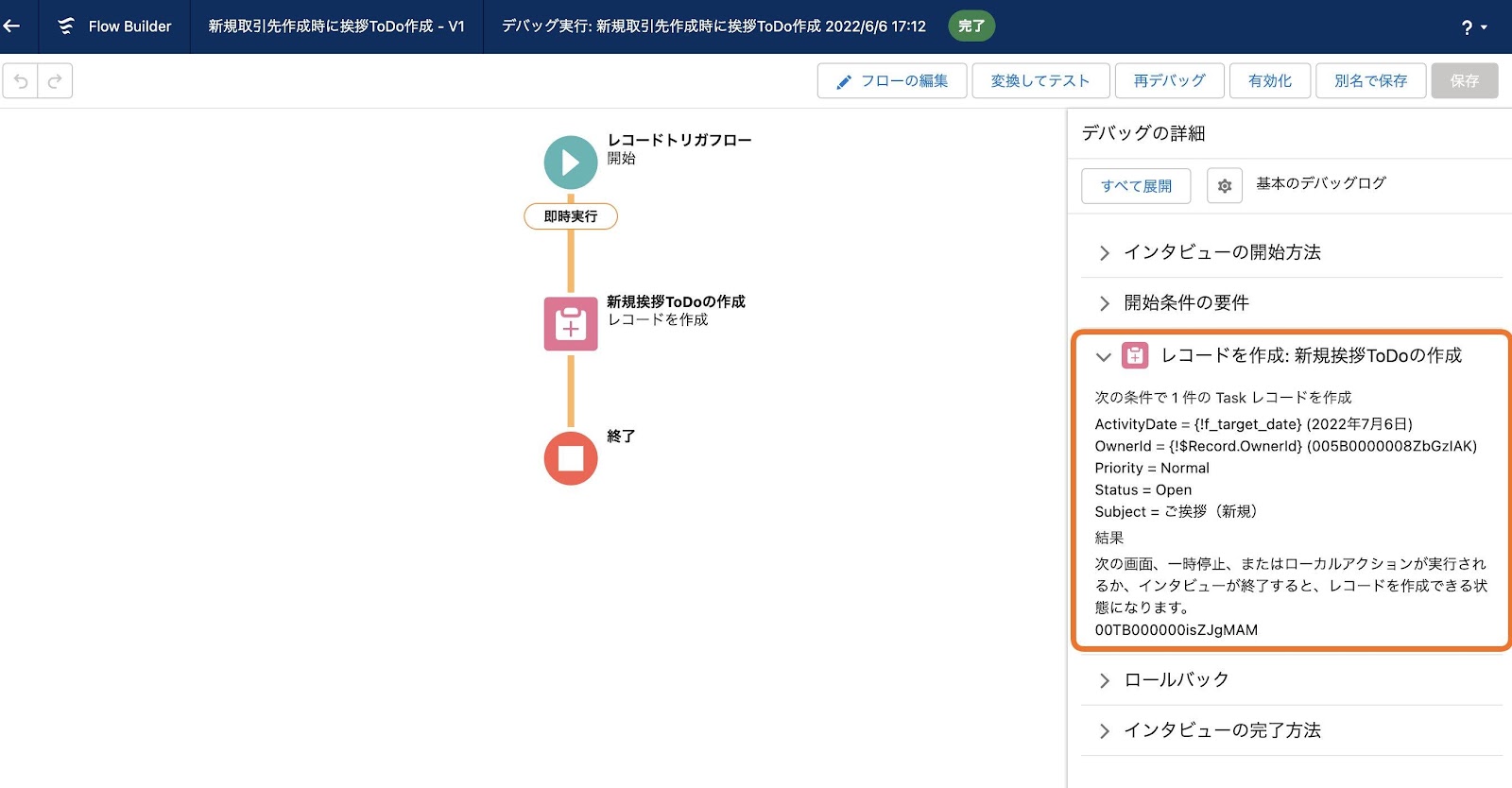 レコードトリガフローは「ロールバックモードでフローを実行します」にチェックが入っています。ロールバックモードで実行すると、処理を実行し最後に保存せずにキャンセルするため、テスト的に実行してエラーが出るか確認できます。