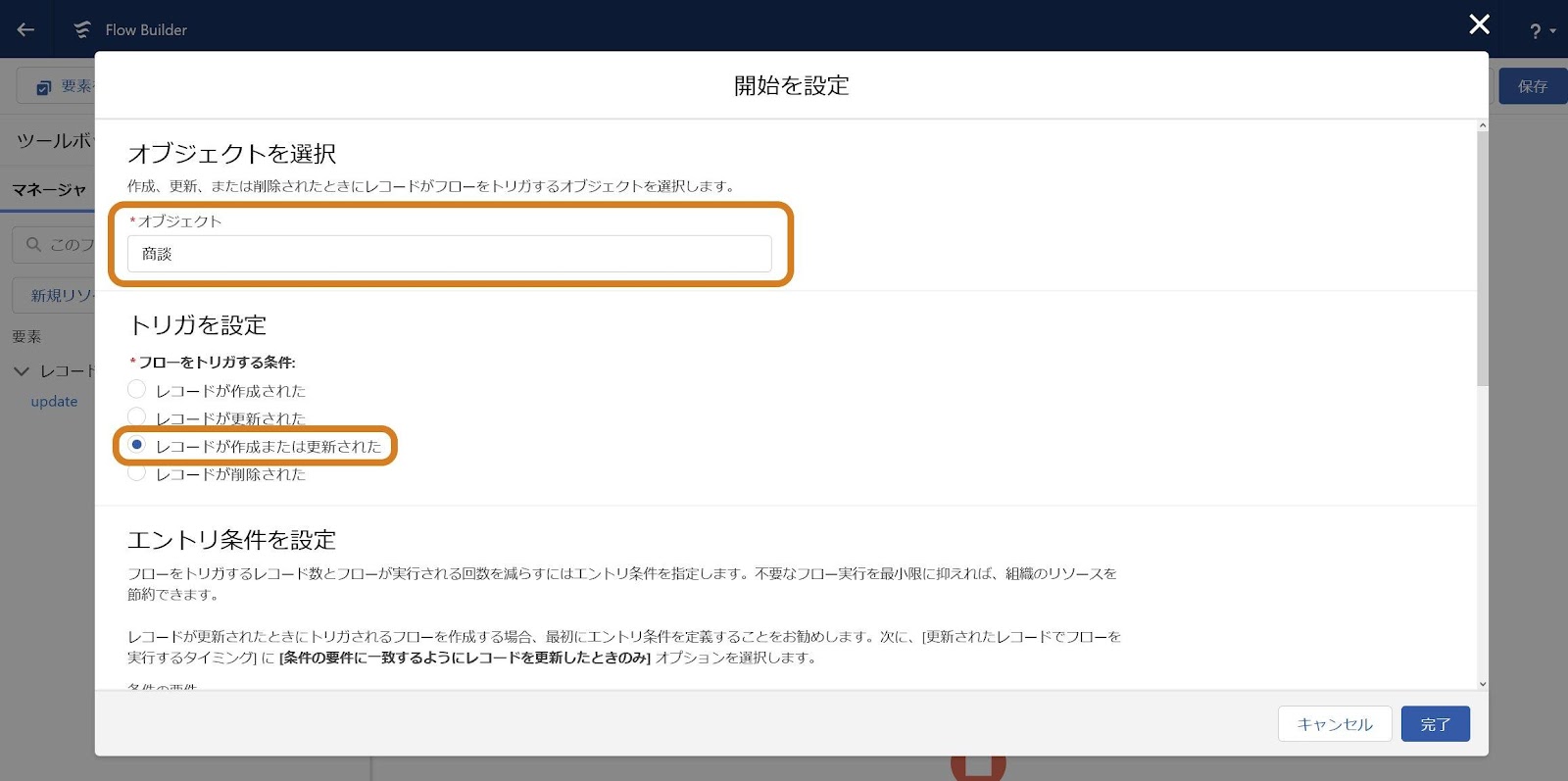 そして「完了」を押します。これで開始条件の設定完了です。