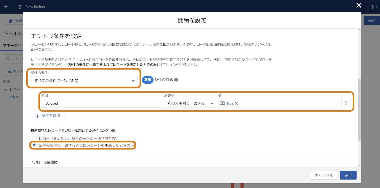 - 更新されたレコードでフローを実行するタイミング : 条件の要件に一致するようにレコードを更新したときのみ