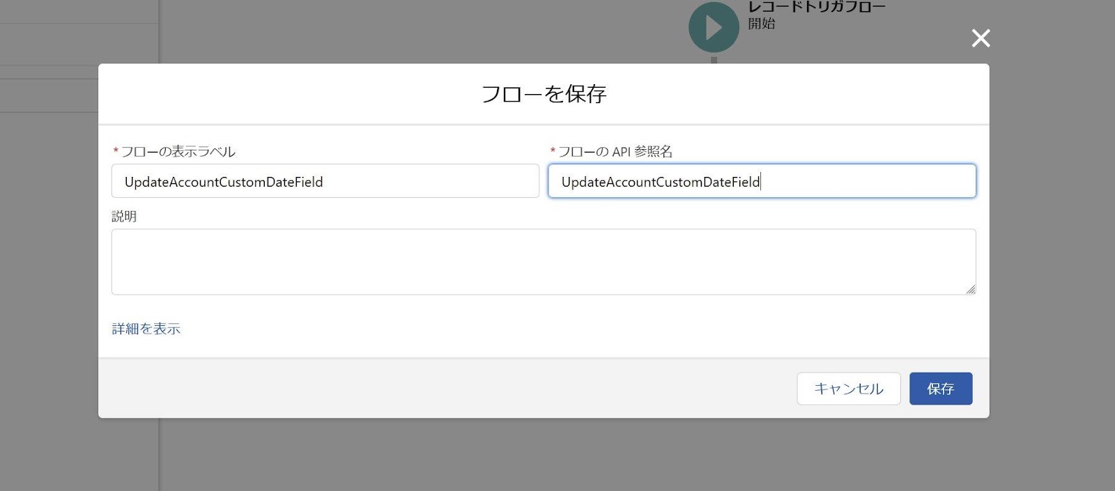 画面右上の「保存」をクリックし、フローの表示ラベル、フローのAPI参照名に任意の値を入力し保存します。