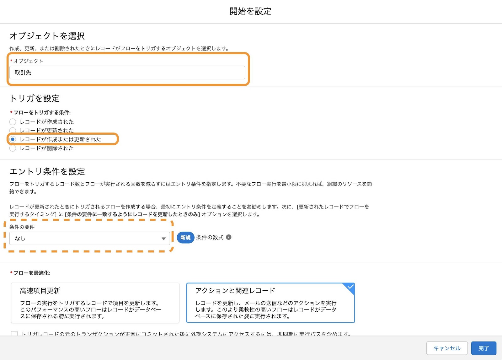 自動処理の開始条件を設定します。今回は、「取引先が新規・更新に作成された時」に処理が実行されるようにしたいため、以下を設定します。