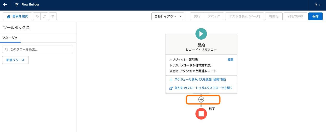 今回は取引先を作成・更新したら、「所有者項目を更新」したいので、次の処理として所有者項目更新の処理をフローに追加します。