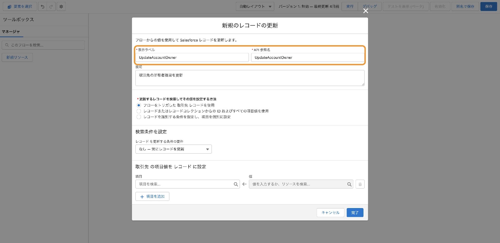 「新規のレコードの更新」画面が開くので、この処理の「表示ラベル」(フローでの表示名)とAPI参照名(処理に対してのプログラム上の名前)を設定します。