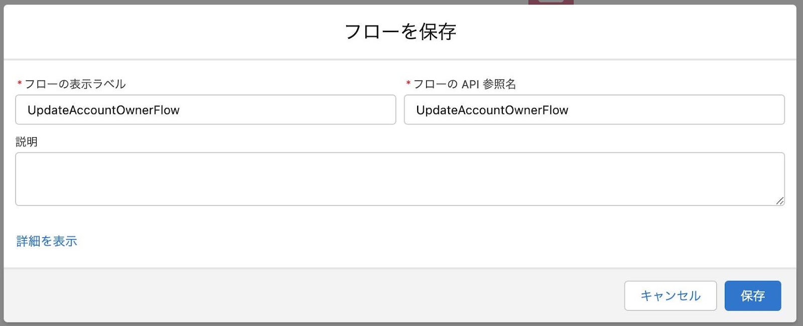 画面右上の「保存」をクリックし、フローの表示ラベル、フローのAPI参照名に任意の値を入力し保存します。