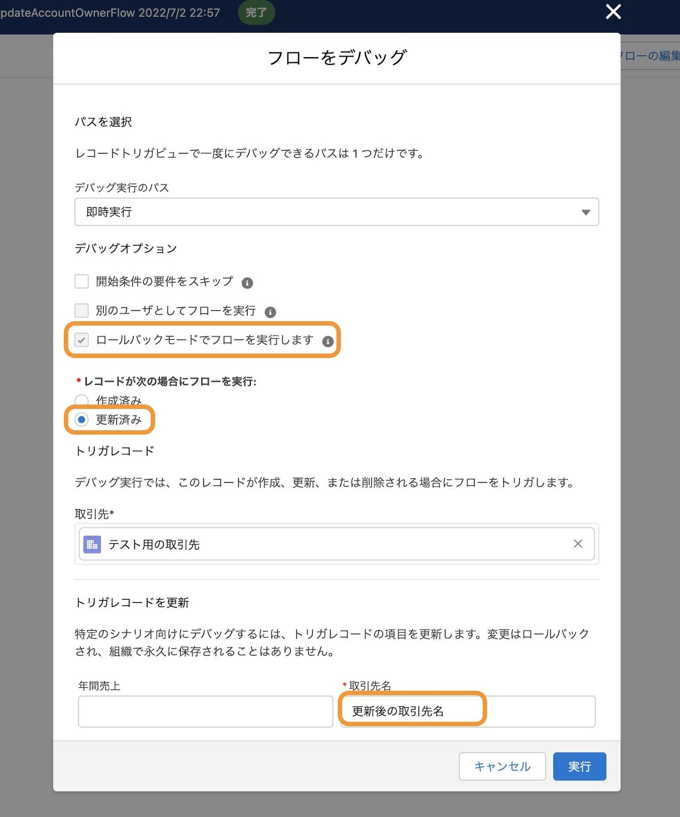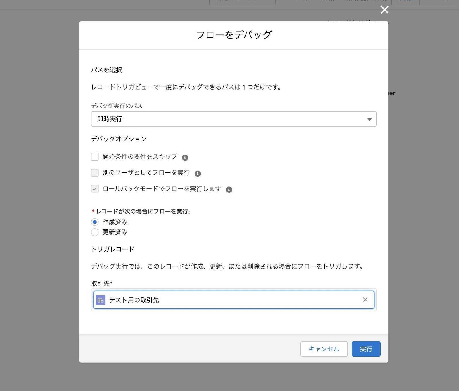 レコード新規作成時のシナリオで問題なくフローをデバッグ実行できたため、次にレコードの更新のシナリオのテストを行います。