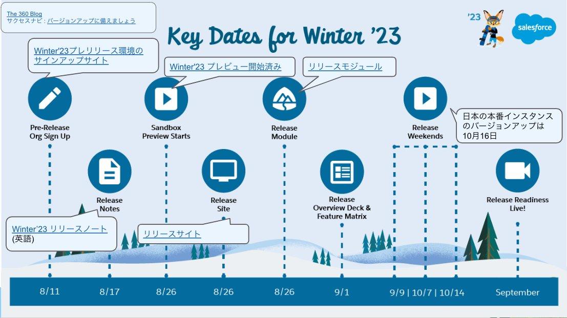 日本時間で、8/28からWinter'23のSandboxプレビューが開始していますので、本番組織におけるリリースまでにプレビューSandboxにて、Winter’23環境におけるテストを実施いただくことを推奨しています。またWinter'23のリリースノートの英語版も公開されておりますので、プレビューSandboxに併せてリリースノートもご活用いただき、Winter'23の環境をご評価いただければと思います。なお、本番組織におけるWinter'23リリースは10月16日を予定しています。