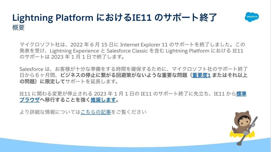 Microsoft社がIE11のサポートを終了したことを受けて、Salesforceも今年一杯でIE11のサポートを終了します。