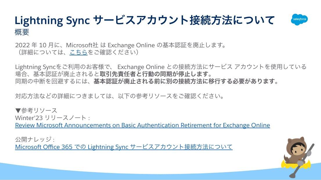 そのため、SalesforceにおいてLightning Syncをご利用の場合に、サービスアカウント接続方法を使用していると影響を受けることになります。対応方法など詳細につきましては、参考リソースに情報がございますので、ご確認ください。