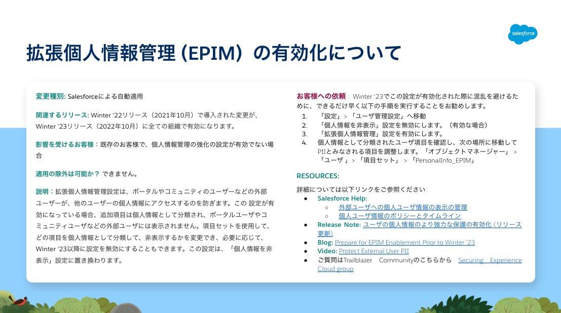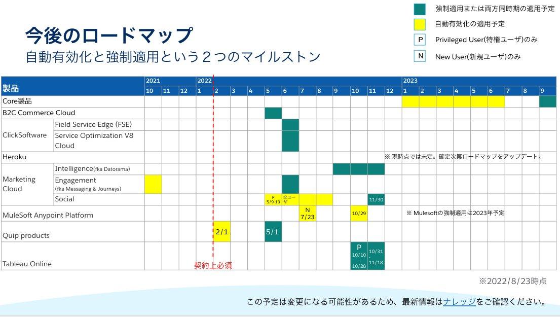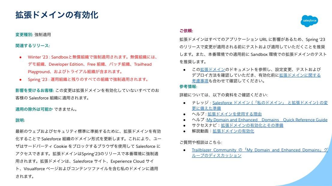 赤字部分に記載している通り、Winter’23でSandboxと無償組織、Spring’23で運用組織への強制適用を予定しております。早めの検証と設定を推奨しておりますので、未設定の方はご確認をお願いいたします。